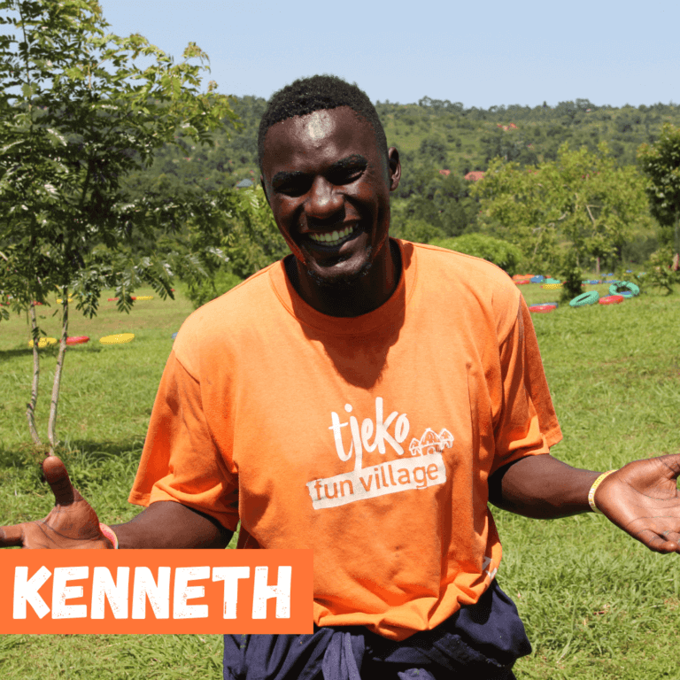 Mijn naam is Yabinze Kenneth. Ik ben 26 jaar oud. Ik leerde Tjeko kennen op de Fun Fair van 2019 in Bugembe, waar mijn vriend Maron zich bij aansloot. Mijn vriend inspireerde me om als vrijwilliger bij Tjeko aan de slag te gaan, en ik wilde de volgende academie in 2020 niet missen. Helaas werd onze academie geannuleerd vanwege COVID-19, maar ik volgde Tjeko nog steeds via de radio en sociale media. Uiteindelijk sloot ik me aan via de academie in 2022. Samen met Robert en Harriet werk ik op het land en zorg ik voor de beveiliging van alle Tjeko-eigendommen. Ik geloof in teamwork.